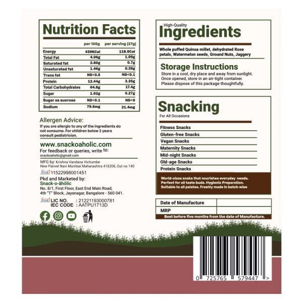 Fuel your day with the perfect blend of nutrition and taste. Our Quinoa Energy Bites are tiny powerhouses crafted from whole puffed quinoa millet, enriched with nutrient-dense watermelon seeds, ground nuts, and a delicate touch of dehydrated rose petals. Naturally sweetened with jaggery, these bites offer a wholesome, guilt-free snack that energizes your body while delighting your senses. Whether it’s a post-workout boost, a midday energy surge, or a healthy late-night nibble, Quinoa Energy Bites are your ideal companion for any moment.